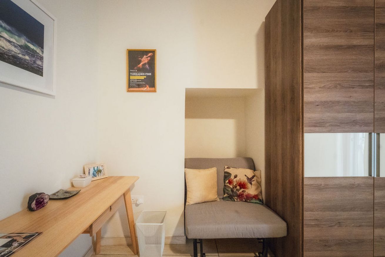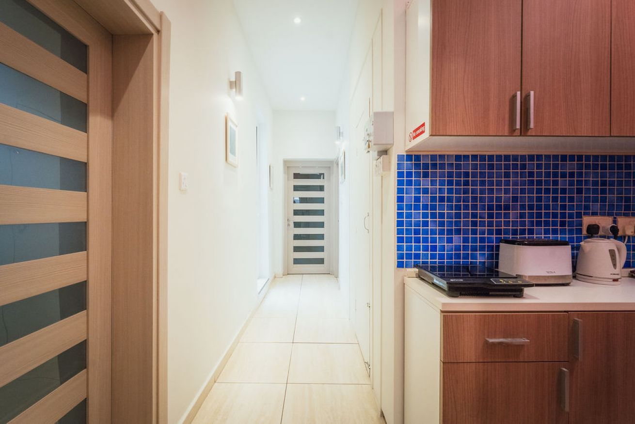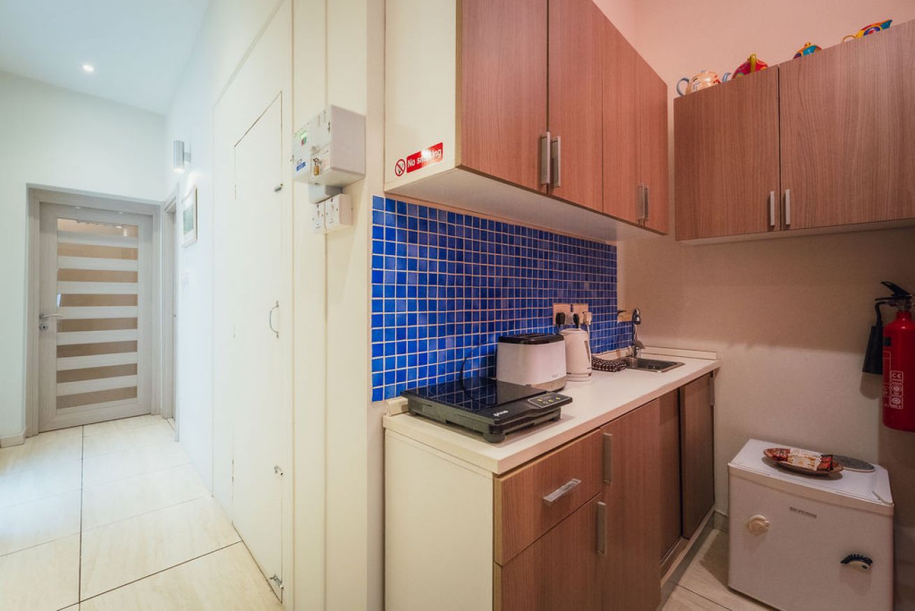 L'appartamento dispone di un angolo cottura compatto e funzionale, dotato di piano cottura a induzione, bollitore, tostapane e un piccolo frigorifero, ideale per preparare pasti leggeri e spuntini durante il soggiorno.