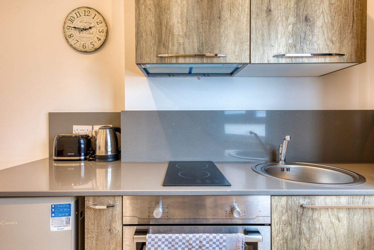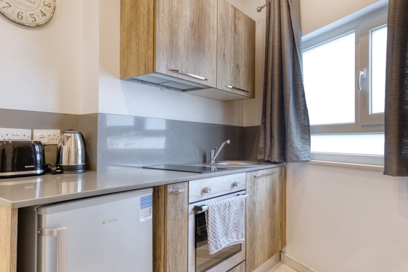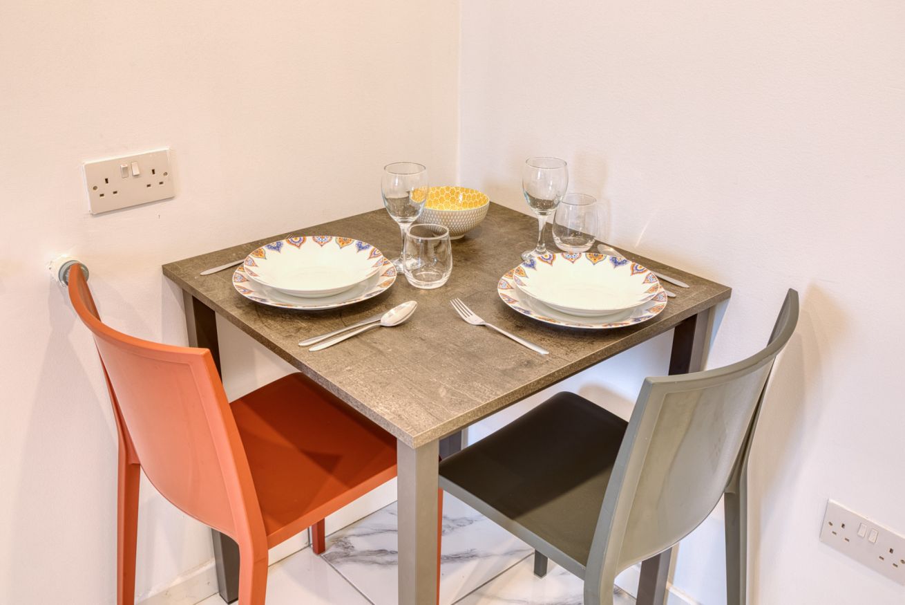 Inside, you'll find a welcoming open-plan living area featuring a Smart TV and WiFi, perfect for relaxing after a day of sightseeing. The kitchenette is fully equipped with a kettle, toaster, oven, hob, fridge, and freezer, and includes a cozy dining area for two. Step out onto the private balcony overlooking the lively square—an ideal spot for morning coffee or an evening drink while soaking up the atmosphere.