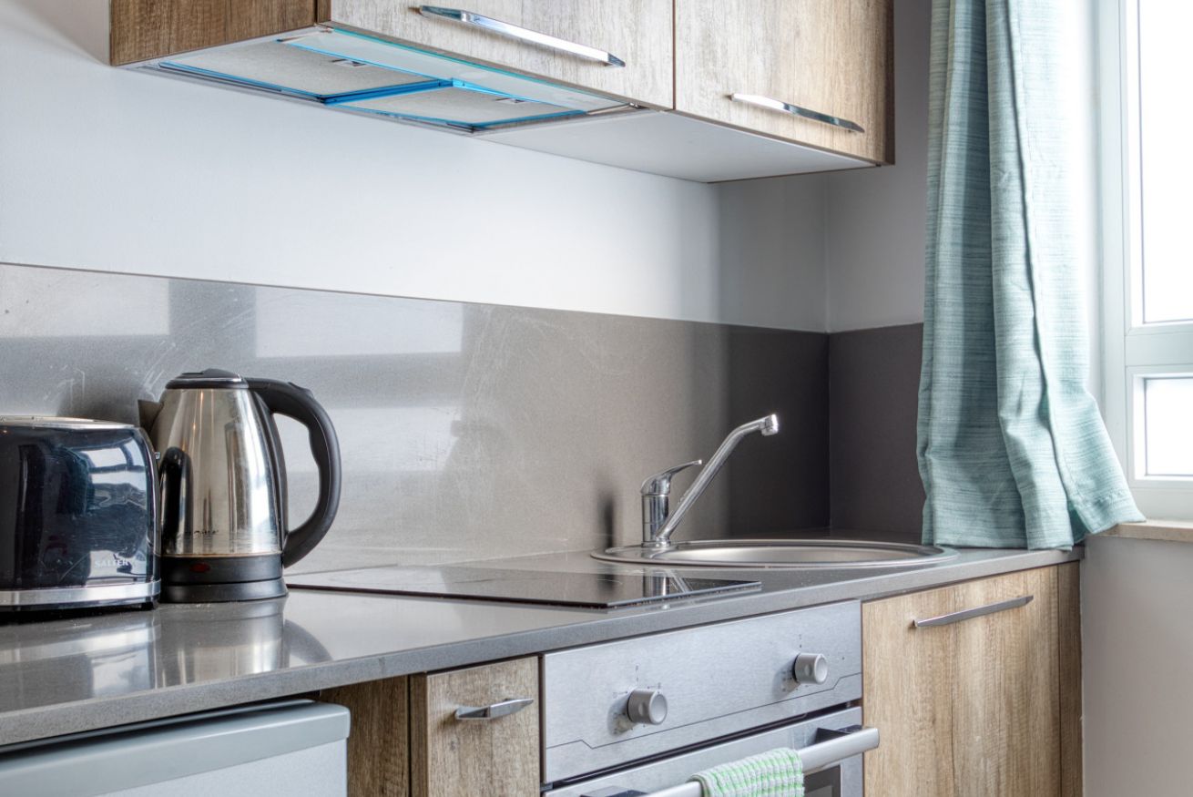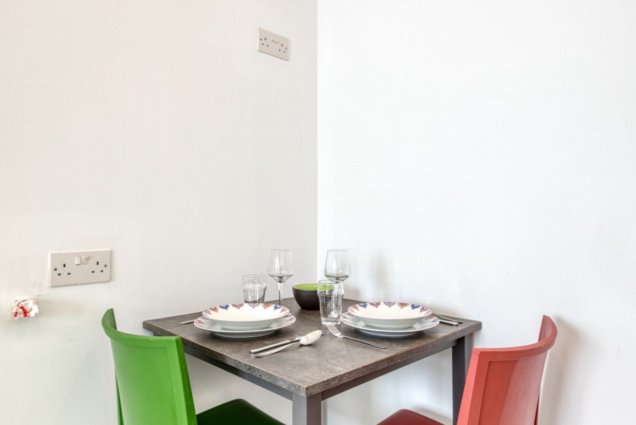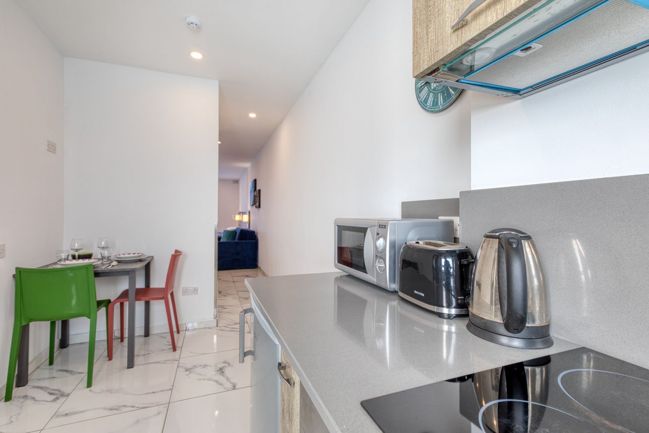 Inside, you'll find a welcoming open-plan living area featuring a Smart TV and WiFi, perfect for relaxing after a day of sightseeing. The kitchenette is fully equipped with a kettle, toaster, oven, hob, fridge, and freezer, and includes a cozy dining area for two. Step out onto the private balcony overlooking the lively square—an ideal spot for morning coffee or an evening drink while soaking up the atmosphere.
